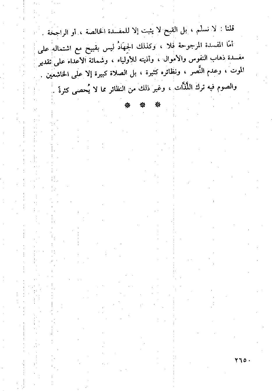 أما المفسدة المرجوحة فلا، وكذلك الجهاد ليس بقبيح مع اشتماله على مفسدة ذهاب النفوس والأموال، وأذيته للأولياء، وشماتة الأعداء على تقدير الموت، وعدم النصر، ونظائره كثيرة، بل الصلاة كبيرة إلا على الخاشعين.