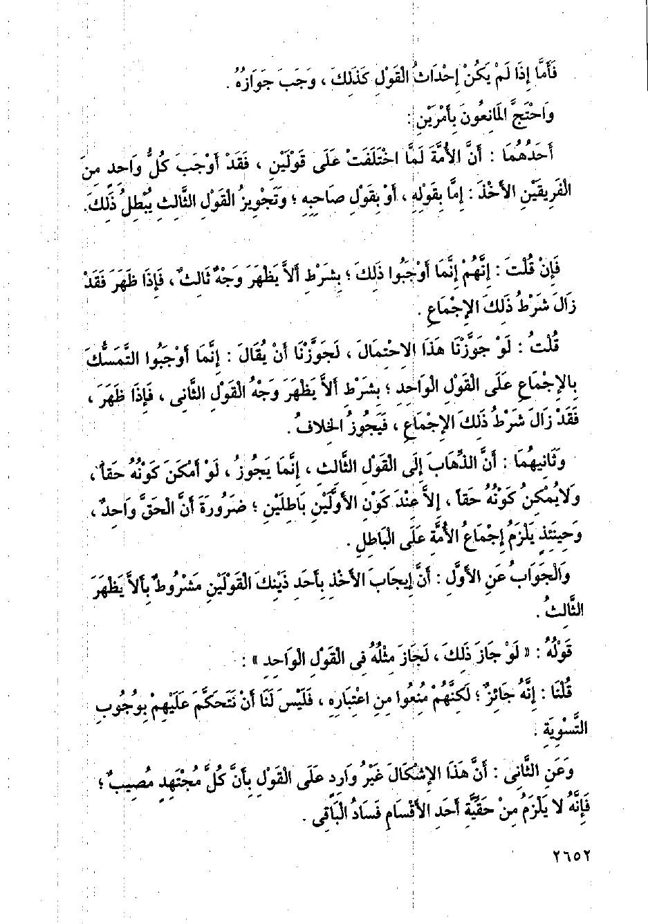 وثانيهما: أن الذهاب إلى القول الثالث، إنما يجوز، لو أمكن كونه حقًا، ولا يمكن كونه حقًا، إلا عند كون الأولين باطلين؛ ضرورة أن الحق واحد، وحينئذٍ يلزم إجماع الأمة على الباطل.