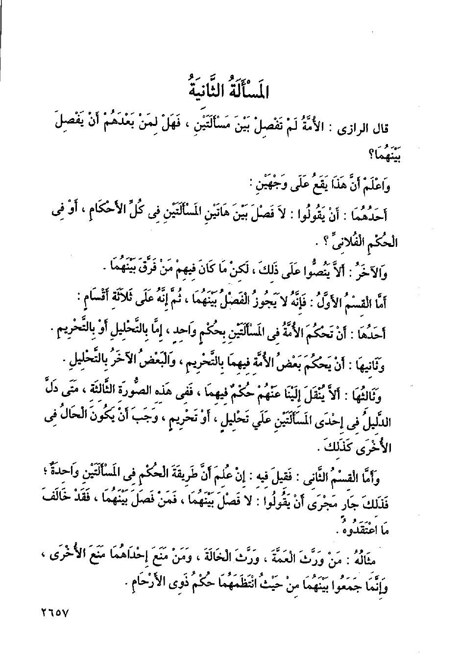 قال الرازي: الأمة لم تفصل بين مسألتين، فهل لمن بعدهم أن يفصل بينهما؟