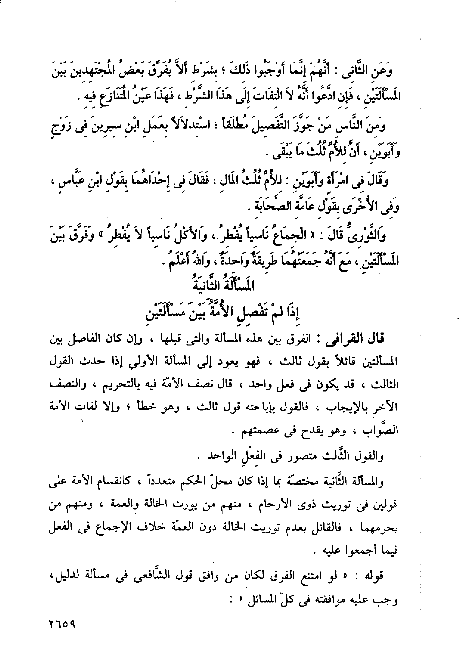قال القرافي: الفرق بين هذه المسألة والتي قبلها، وإن كان الفاصل بين المسألتين قائلا بقول ثالث، فهو يعود على المسألة الأولي إذا حدث القول الثالث، قد يكون في فعل واحد، قال نصف الأمة فيه بالتحريم، والنصف الآخر بالإيجاب، فالقول بإباحته قول ثالث، وهو خطأ؛ وإلا لفات الأمة الصواب، وهو يقدح في عصمتهم.