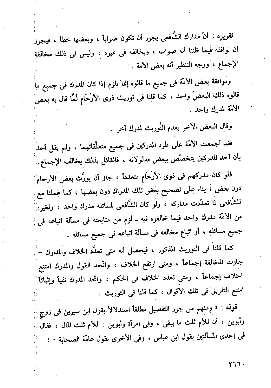 فلو كان مدركهم في ذوى الأرحام متعددًا، جاز أن يورث بعض الأرحام دون بعض؛ بناء على تصحيح بعض تلك المدارك دون بعضها، كما عملنا مع للشافعي لما تعددت مداركه، ولو كان الشافعي لمسائله مدرك واحد، ولغيره من الأمة مدرك واحد فيما خالفوه فيه - لزم من متابعته في مسألة إتباعه في جميع مسائله، أو ابتاع مخالفه في مسألة إتباعه في جميع مسائله.