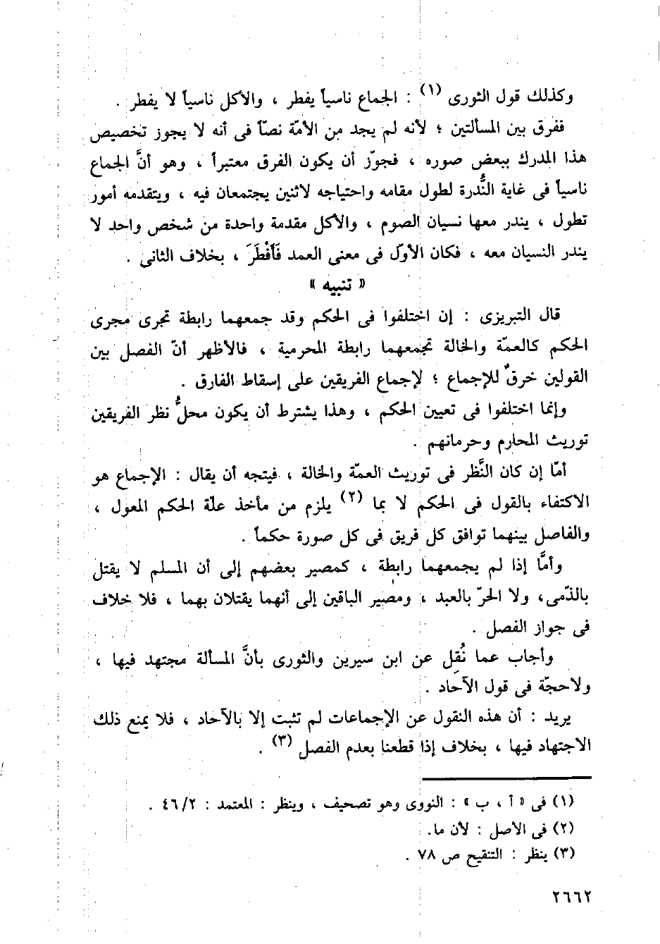 قال التبريزي: إن اختلفوا في الحكم وقد جمعهما رابطة تجرى مجرى الحكم كالعمة والخالة تجمعهما رابطة المحرمية، فالأظهر أن الفصل بين القولين خرق للإجماع؛ لإجماع الفريقين على إسقاط الفارق.