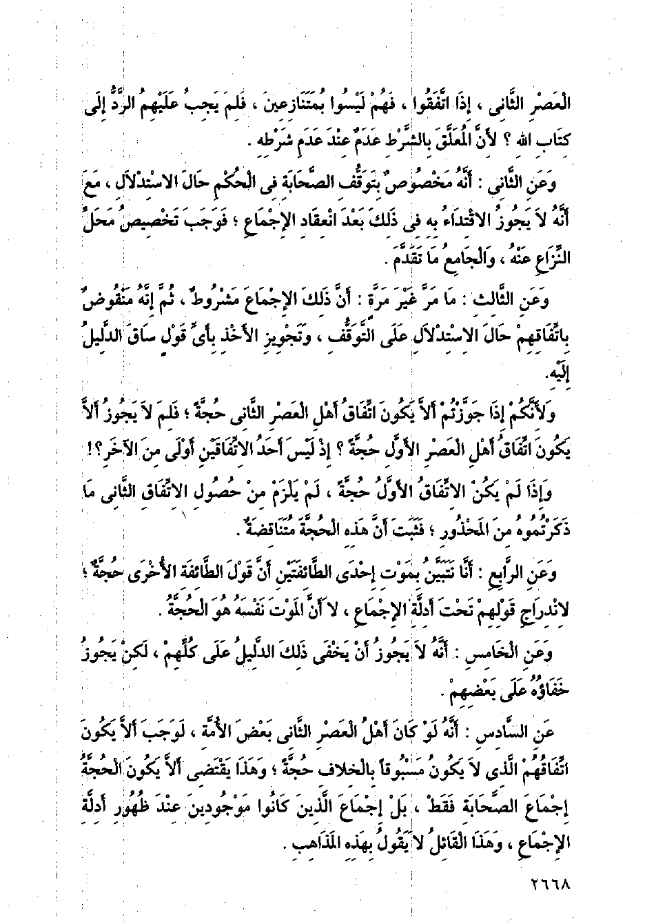عن السادس: أنه لو كان أهل العصر الثاني بعض الأمة، لوجب ألا يكون اتفاقهم الذي لا يكون مسبوقًا بالخلاف حجةً؛ وهذا يقتضي ألا يكون الحجة إجماع الصحابة فقط، بل إجماع الذين كانوا موجودين عند ظهور أدلة الإجماع، وهذا القائل لا يقول بهذه المذاهب.