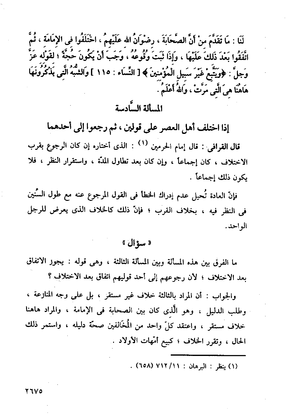 قال القرافي: قال إمام الحرمين: الذي اختاره إن كان الرجوع بقرب الاختلاف، كان إجماعًا، وإن كان بعد تطاول المدة، واستقرار النظر، فلا يكون ذلك إجماعًا.