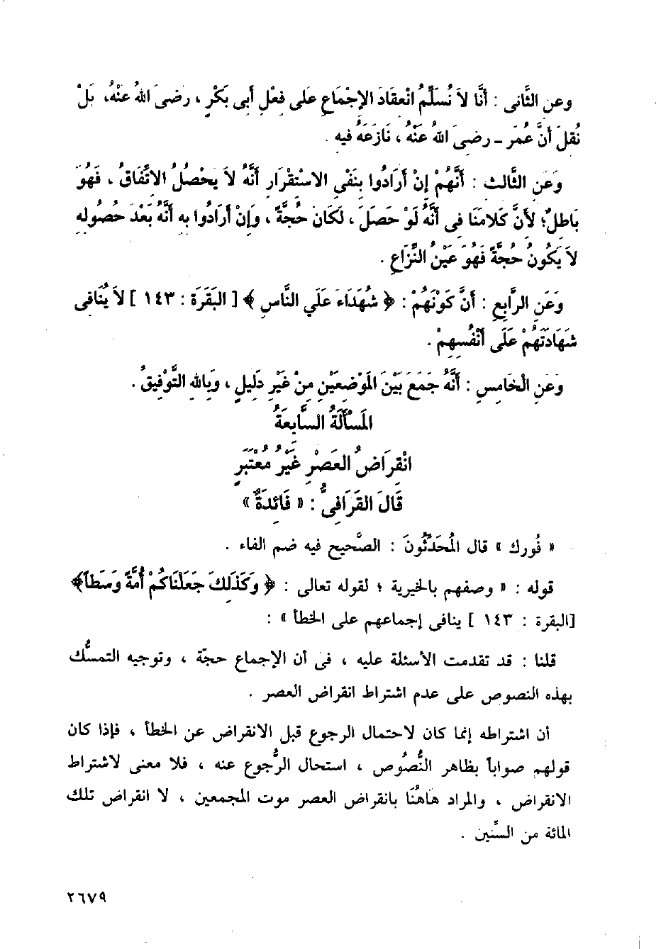 أن اشتراطه إنما كان لاحتمال الرجوع قبل الانقراض عن الخطأ، فإذا كان قولهم صوابًا بظاهر النصوص، استحال الرجوع عنه، فلا معنى لاشتراط الانقراض، والمراد هاهنا بانقراض العصر موت المجمعين، لا انقراض تلك المائة من السنين.