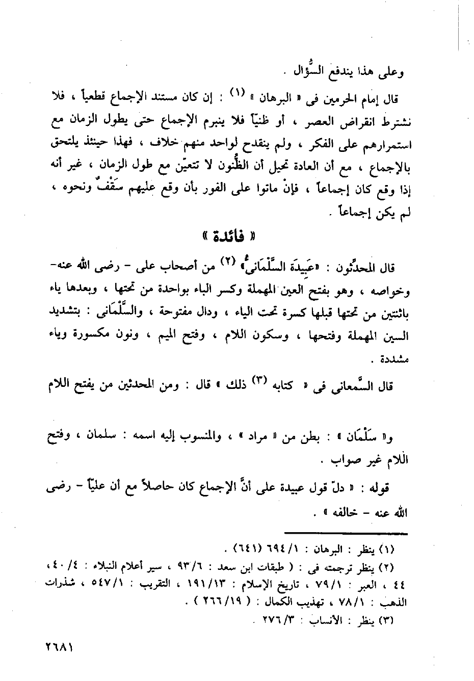 قال المحدثون: (عبيدة السلماني) من أصحاب علي - رضي الله عنه - وخواصه، وهو بفتح العين المهملة وكسر الباء بواحدة من تحتها، وبعدها ياء باثنتين من تحتها قبلها كسرة تحت الياء، ودال مفتوحة، والسلماني: بتشديد السين المهملة وفتحها، وسكون اللام، وفتح الميم، ونون مكسورة وياء مشددة.