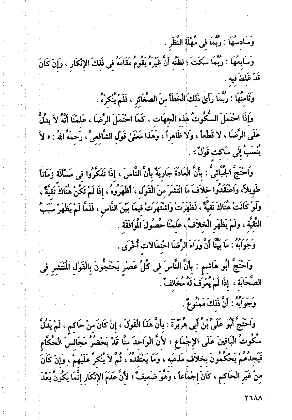 وإذا احتمل السكوت هذه الجهات، كما احتمل الرضا، علمنا أنه لا يدل على الرضا، لا قطعًا، ولا ظاهرًا، وهذا معنى قول الشافعي، رحمه الله: (لا ينسب إلى ساكتٍ قول).