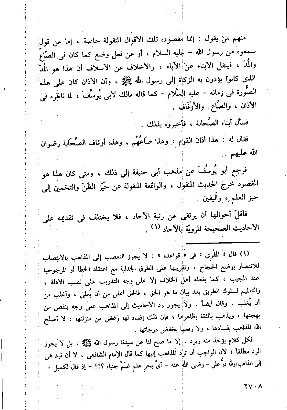 منهم من يقول: إنما مقصوده تلك الأقوال المنقولة خاصة، إما عن قولٍ سمعوه من رسول الله - عليه السلام، أو عن فعل وضع كما كان في الصاع والمد، فينقل الأبناء عن الآباء، والإخلاف عن الأسلاف أن هذا هو المد الذي كانوا يؤدون به الزكاة إلى رسول الله - صلى الله عليه وسلم -، وأن الأذان كان على هذه الصورة في زمانه - عليه السلام - كما قاله مالك لأبي يوسف، لما ناظره في الأذان، والصاع. والأوقاف.