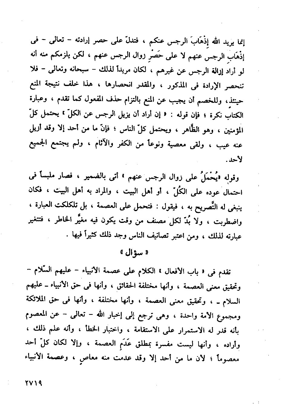 وقوله (يحمل على زوال الرجس عنهم) أتي بالضمير، فصار ملبسًا في احتمال عوده على الكل، أو أهل البيت، والمراد به أهل البيت، فكان ينبغي له التصريح به، فيقول: فتحمل على العصمة، بل تلكلكت العبارة، واضطربت، ولابد لكل مصنف من وقت يكون فيه مغير الخاطر، فتتغير عبارته لذلك، ومن اعتبر تصانيف الناس وجد ذلك كثيرًا فيها.