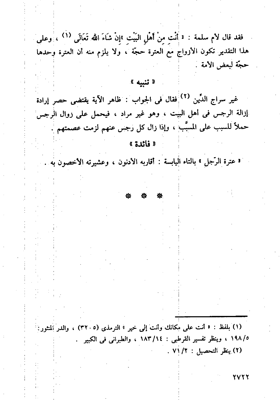 فقد قال لأم سلمة: (أنت من أهل البيت) إن شاء الله تعالى، وعلى هذا التقدير تكون الأزواج مع العترة حجة، ولا يلزم منه أن العترة وحدها حجة لبعض الأمة.