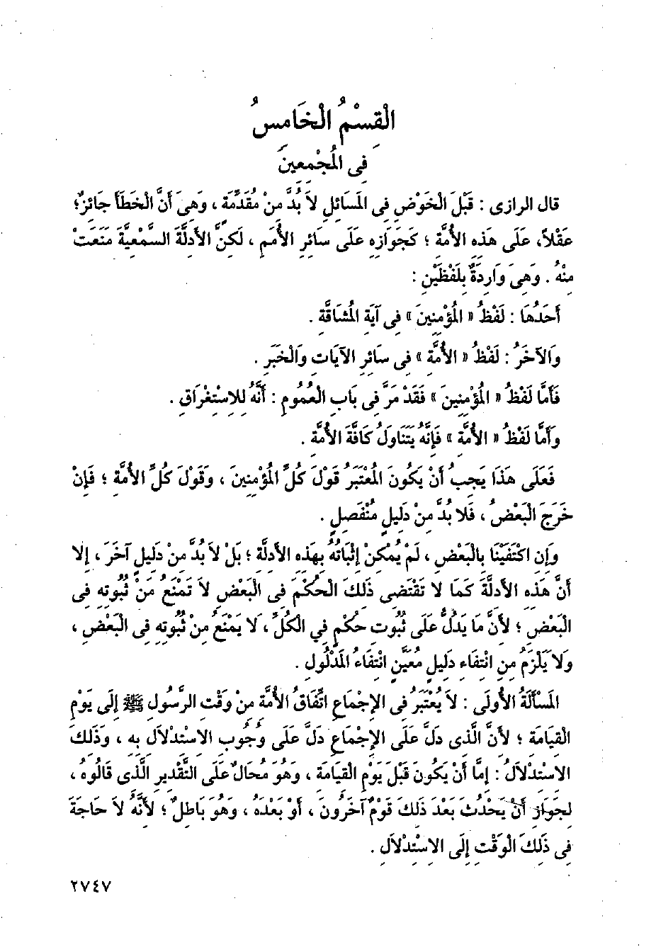 المسألة الأولى: لا يعتبر في الإجماع اتفاق الأمة من وقت الرسول - صلى الله عليه وسلم - إلى يوم القيامة؛ لأن الذي دل على الإجماع دل على وجوب الاستدلال به، وذلك الاستدلال: إما أن يكون قبل يوم القيامة، وهو محال على التقدير الذي قالوه، لجواز أن يحدث بعد ذلك قوم آخرون، أو بعده، وهو باطل؛ لأنه لا حاجة في ذلك الوقت إلى الاستدلال.