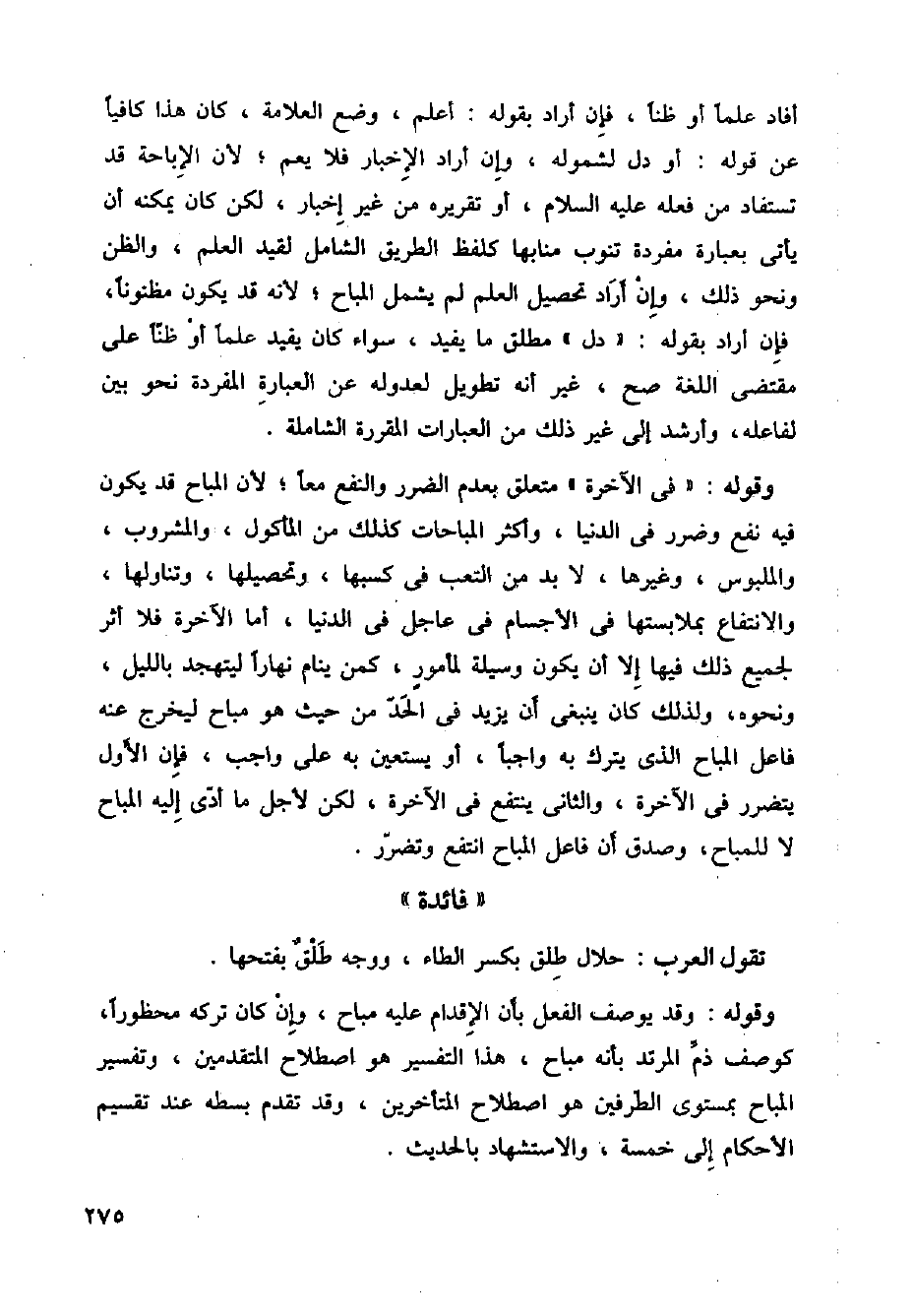 وقوله: ((في الآخرة)) متعلق بعدم الضرر والنفع معا، لأن المباح قد يكون فيه نفع وضرر في الدنيا، وأكثر المباحات كذلك من المأكول، والمشروب، والملبوس، وغيرها، لابد من التعب في كسبها، وتحصيلها، وتناولها، والانتفاع بملابستها في الأجسام في عاجل في الدنيا، أما الآخرة فلا أثر لجيمع ذلك فيها إلا أن يكون وسيلة لمأمور، كمن ينام نهارا ليتهجد بالليل، ونحوه، ولذلك كان ينبغي أن يزيد في الحد من حيث هو مباح ليخرج عنه فاعل المباح الذي يترك به واجبا، أو يستعين به على واجب، فإن الأول يتضرر في الآخرة، والثاني ينتفع في الآخرة، لكن لأجل ما أدَّى إليه المباح لا للمباح، وصدق أن فاعل المباح انتفع وتضرر.