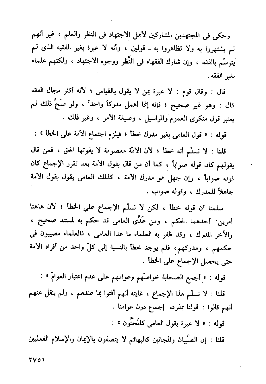 قلنا: لا نسلم أنه خطأ؛ لأن الأمة معصومة لا يفوتها الحق، فمن قال بقولهم كان قوله صوابا، كما أن من قال بقول الأمة بعد تقرر الإجماع كان قوله صوابا، وإن جهل هو مدرك الأمة، كذلك العامي يقول بقول الأمة جاهلا للمدرك، وقوله صواب.