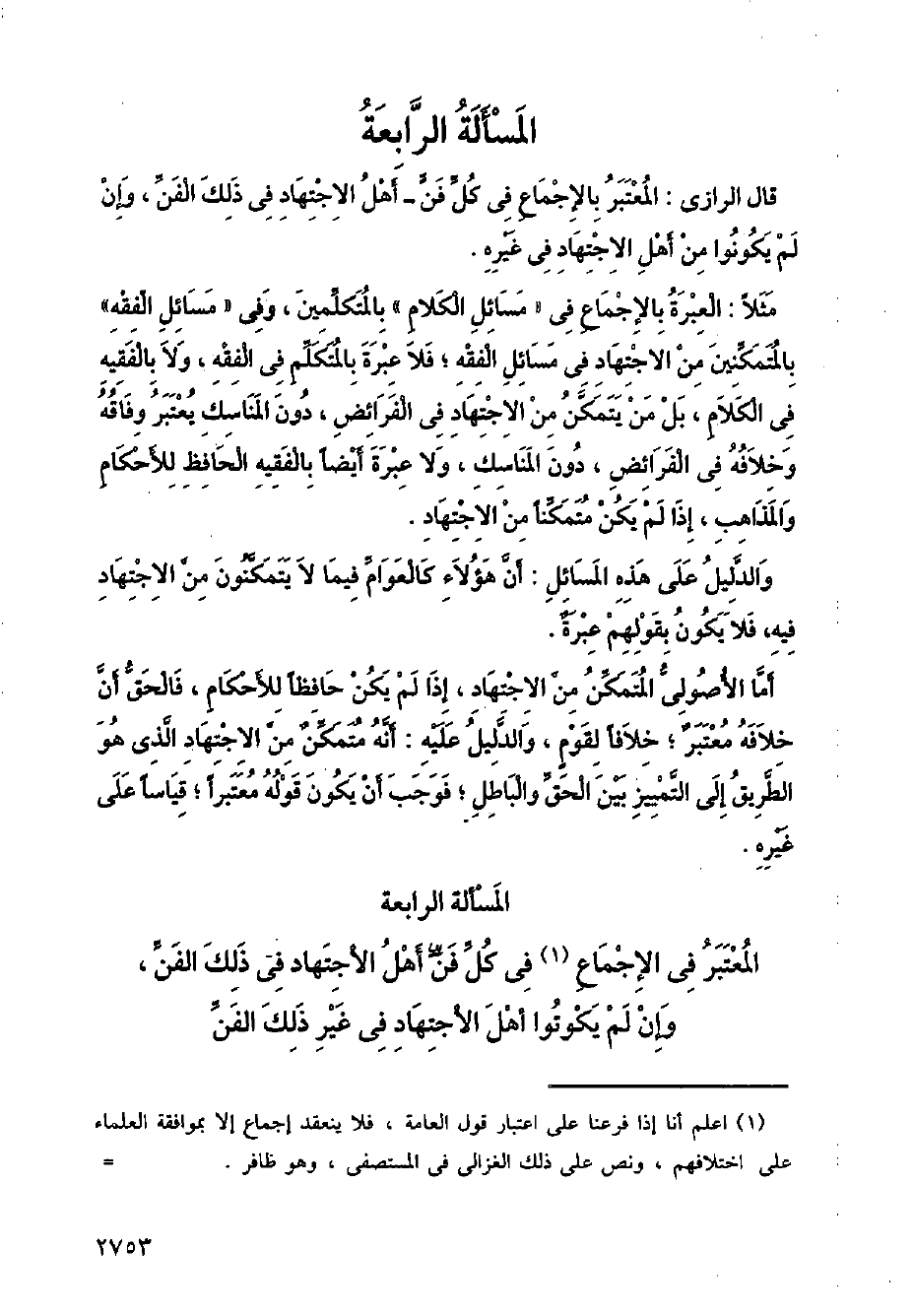 مثلا: العبرة بالإجماع في (مسائل الكلام) بالمتكلمين، وفي (مسائل الفقه) بالمتمكنين من الاجتهاد في مسائل الفقه؛ فلا عبرة بالمتكلم في الفقه، ولا بالفقيه في الكلام، بل من يتمكن من الاجتهاد في الفرائض، دون المناسك يعتبر وفاقه وخلافه في الفرائض، دون المناسك، ولا عبرة أيضا بالفقيه الحافظ للأحكام والمذاهب، إذا لم يكن متمكنا من الاجتهاد.