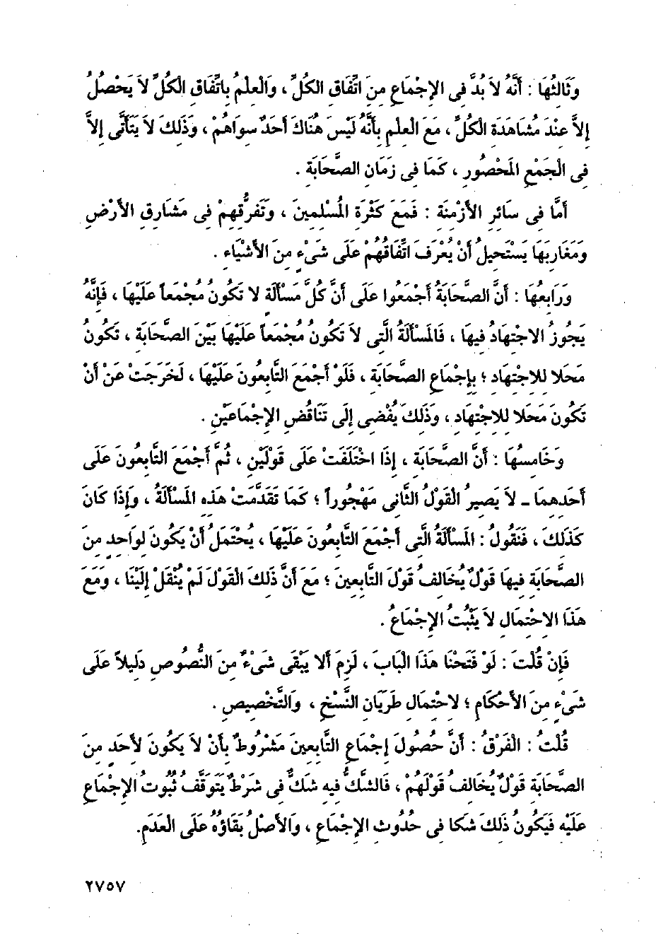وثالثها: أنه لابد في الإجماع من اتفاق الكل، والعلم باتفاق الكل لا يحصل إلا عند مشاهدة الكل، مع العلم بأنه ليس هناك أحد سواهم، وذلك لا يتأتى إلا في الجمع المحصور، كما في زمان الصحابة.