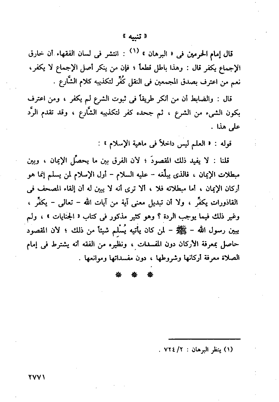 قال إمام الحرمين في (البرهان): انتشر في لسان الفقهاء أن خارق الإجماع يكفر قال: وهذا باطل قطعا؛ فإن من ينكر أصل الإجماع لا يكفر، نعم من اعترف بصدق المجتمعين في النقل كفر لتكذيبه كلام الشارع.