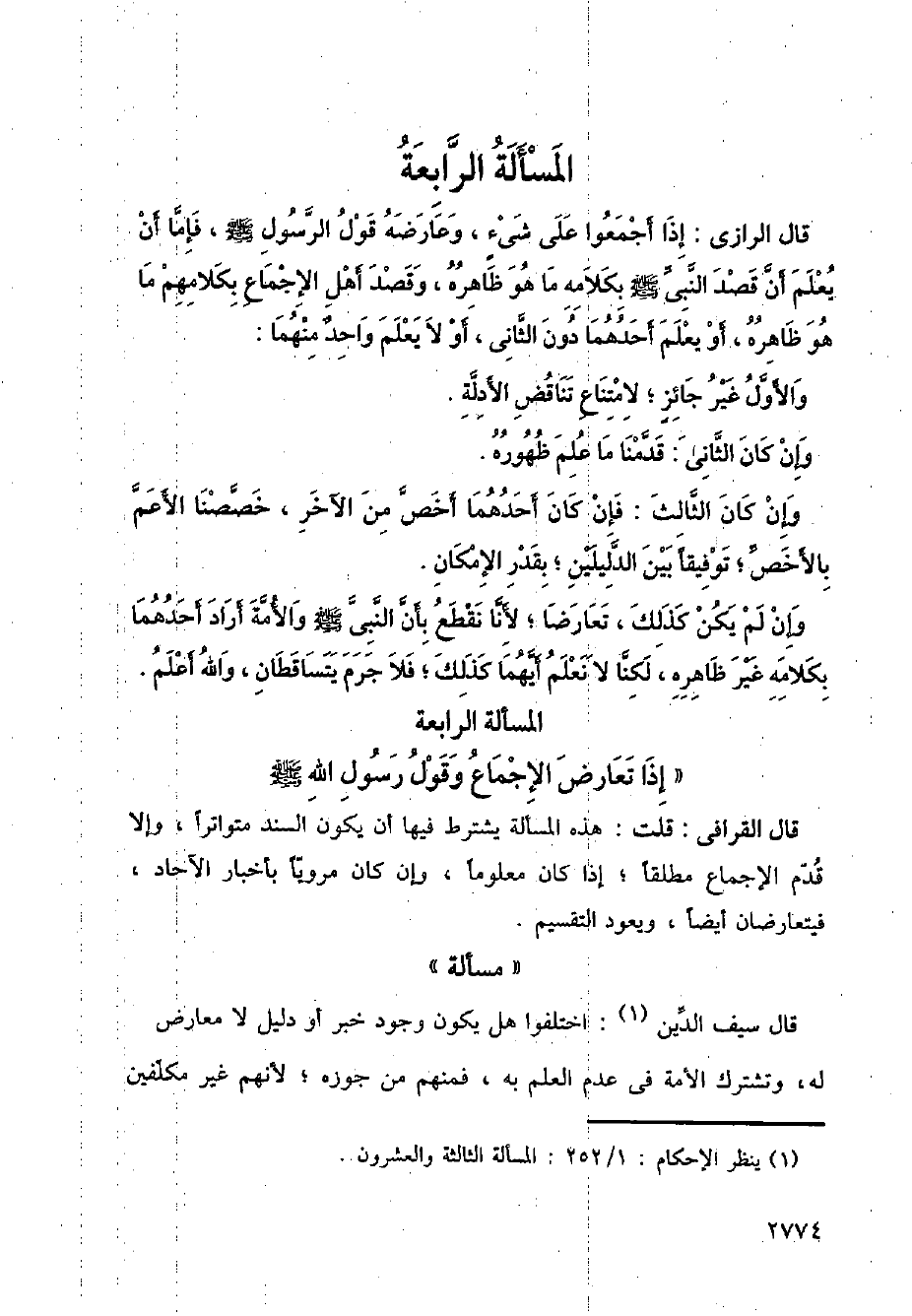 قال الرازي: إذا أجمعوا على شيء، وعارضه قول الرسول - صلى الله عليه وسلم -، فإما أن يعلم أن قصد النبي - صلى الله عليه وسلم - بكلامه ما هو ظاهره، وقصد أهل الإجماع بكلامهم ما هو ظاهره، أو يعلم أحدهما دون الثاني، أو لا يعلم واحد منهما: