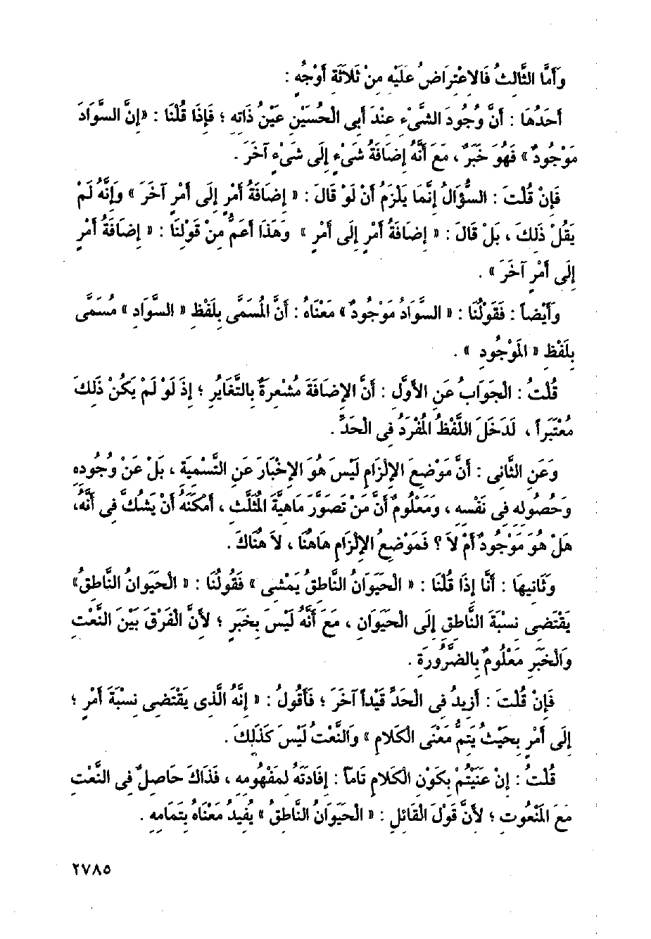 وعن الثاني: أن موضع الإلزام ليس هو الإخبار عن التسمية، بل عن وجوده وحصوله في نفسه، ومعلوم أن من تصور ماهية المثلث، أمكنه أن يشك في أنه، هل هو موجود أم لا؟ فموضع الإلزام هاهنا، لا هناك.
