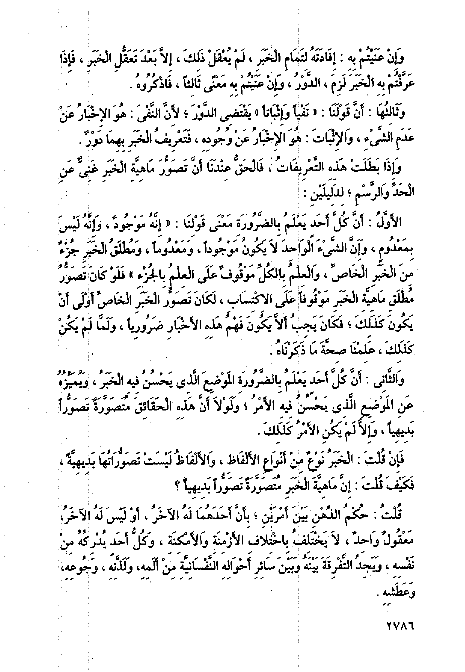 الأول: أن كل أحد يعلم بالضرورة معنى قولنا: "إنه موجود، وإنه ليس بمعدوم، وإن الشيء الواحد لا يكون موجودا، ومعدوما، ومطلق الخبر جزء من الخبر الخاص، والعلم بالكل موقوف على العلم بالجزء" فلو كان تصور مطلق ماهية الخبر موقوفا على الاكتساب، لكان تصور الخبر الخاص أولى أن يكون كذلك؛ فكان يجب ألا يكون فهم هذه الأخبار ضروريا، ولما لم يكن كذلك، علمنا صحة ما ذكرناه.