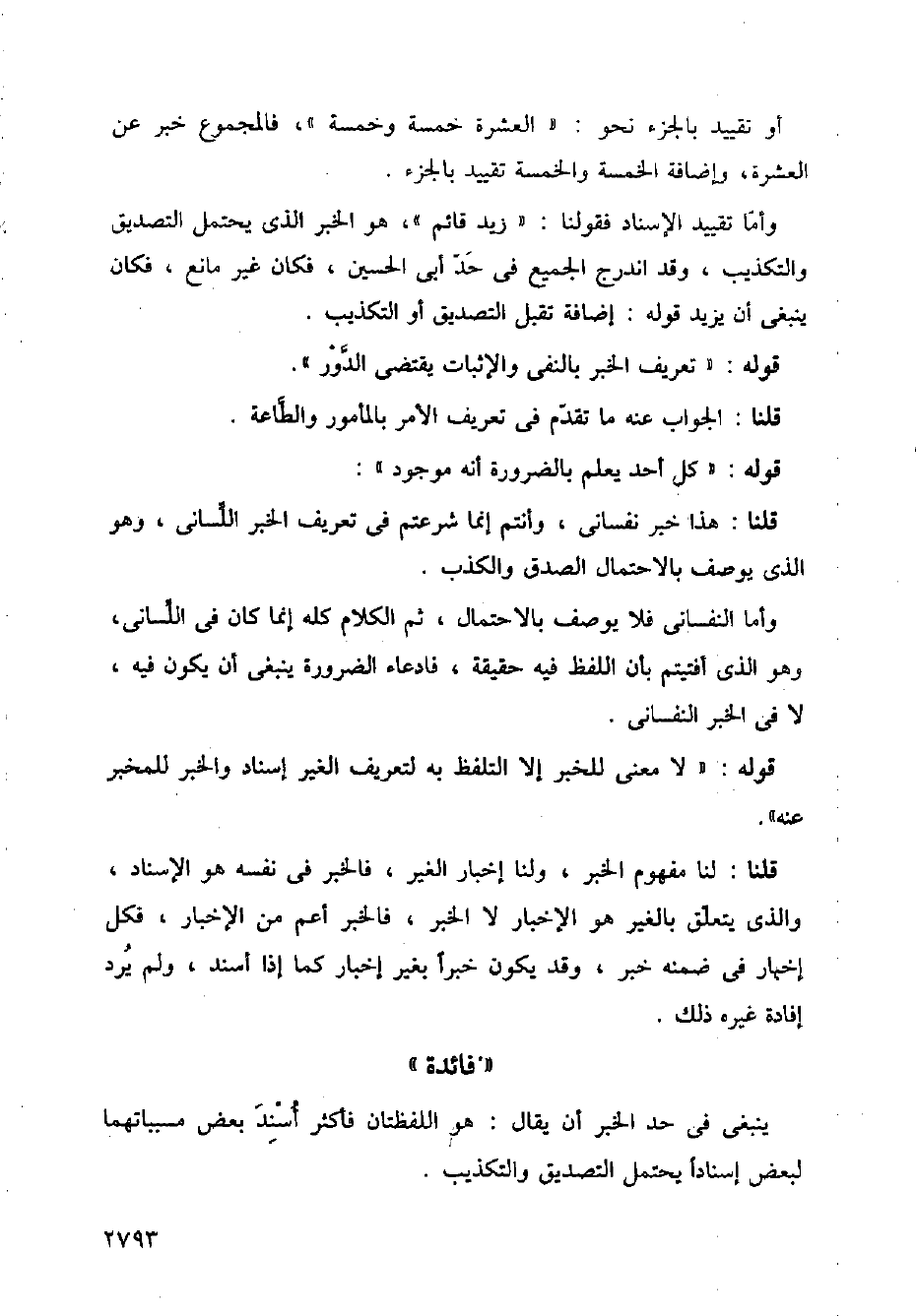 وأما تقييد الإسناد فقولنا: "زيد قائم"، هو الخبر الذي يحتمل التصديق والتكذيب، وقد اندرج الجميع في حد أبي الحسين، فكان غير مانع، فكان ينبغي أن يزيد قوله: إضافة تقبل التصديق أو التكذيب.