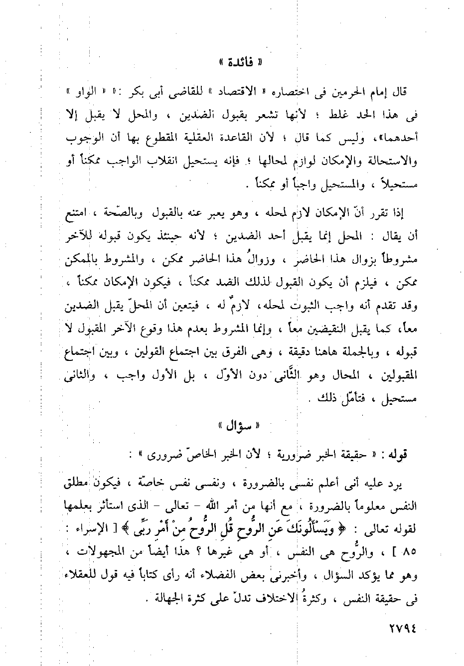 يرد عليه أني أعلم نفسي بالضرورة، ونفسي نفس خاصة، فيكون مطلق النفس معلوما بالضرورة، مع أنها من أمر الله- تعالى- الذي استأثر بعلمها لقوله تعالى: {ويسألونك عن الروح قل الروح من أمر ربي} [الإسراء: 85]، والروح هي النفس، أو هي غيرها؟ هذا أيضا من المجهولات، وهو مما يؤكد السؤال، وأخبرني بعض الفضلاء أنه رأى كتابا فيه قول للعقلاء في حقيقة النفس، وكثرة الاختلاف تدل على كثرة الجهالة.