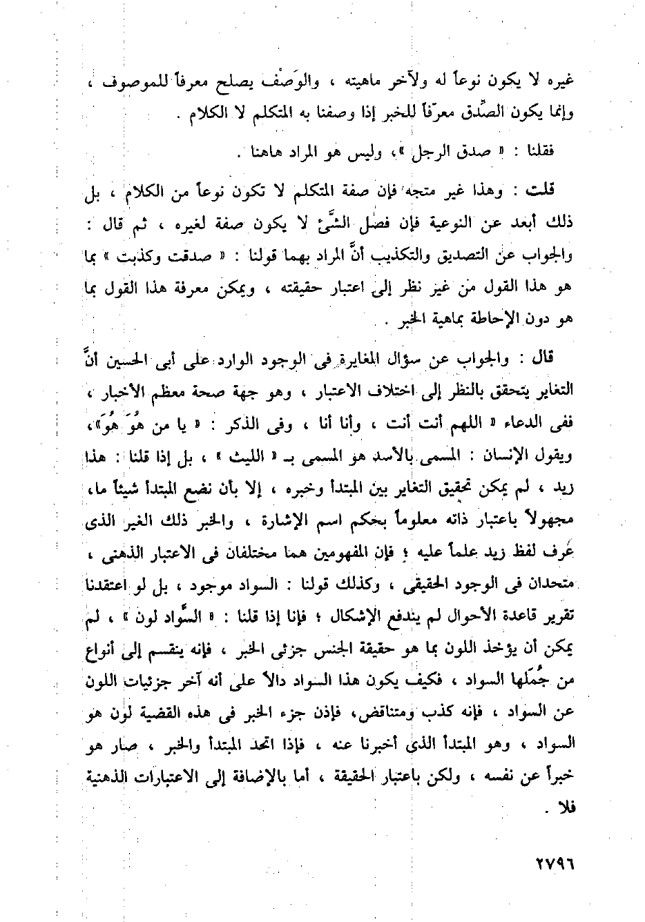 غيره لا يكون نوعا له ولآخر ماهيته، والوصف يصلح معرفا للموصوف، وإنما يكون الصدق معرفا للخبر إذا وصفنا به المتكلم لا الكلام.
