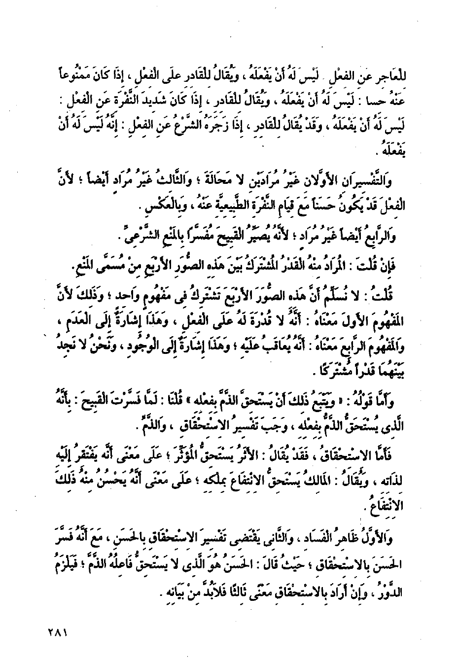 والأول ظاهر الفساد، والثاني يقتضي تفسير الاستحقاق بالحسن، مع أنه فسر الحسن بالاستحقاق؛ حيث قال: الحسن هو الذي لا يستحق فاعله الذم فيلزم الدور، وإن أراد بالاستحقاق معنى ثالثا فلا بد من بيانه.