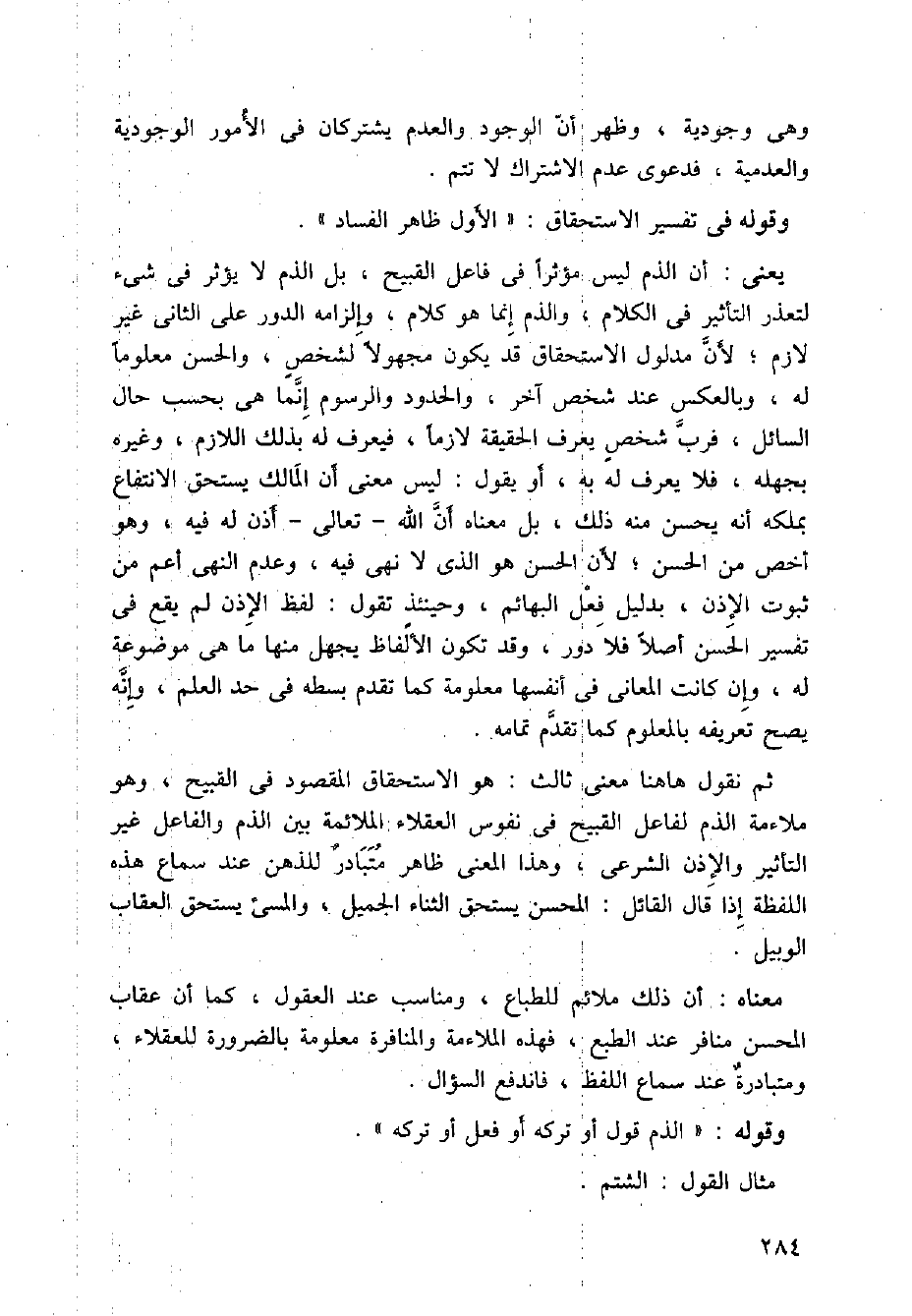 ثم نقول هاهنا معنى ثالث: هو الاستحقاق المقصود في القبيح، وهو ملائمة الذم لفاعل القبيح في نفوس العقلاء الملائمة بين الذم والفاعل غير التأثير والإذن الشرعي، وهذا المعنى ظاهر متبادر للذهن عند سماع هذه اللفظة إذا قال القائل: المحسن يستحق الثناء الجميل، والمسيء يستحق العقاب الوبيل.