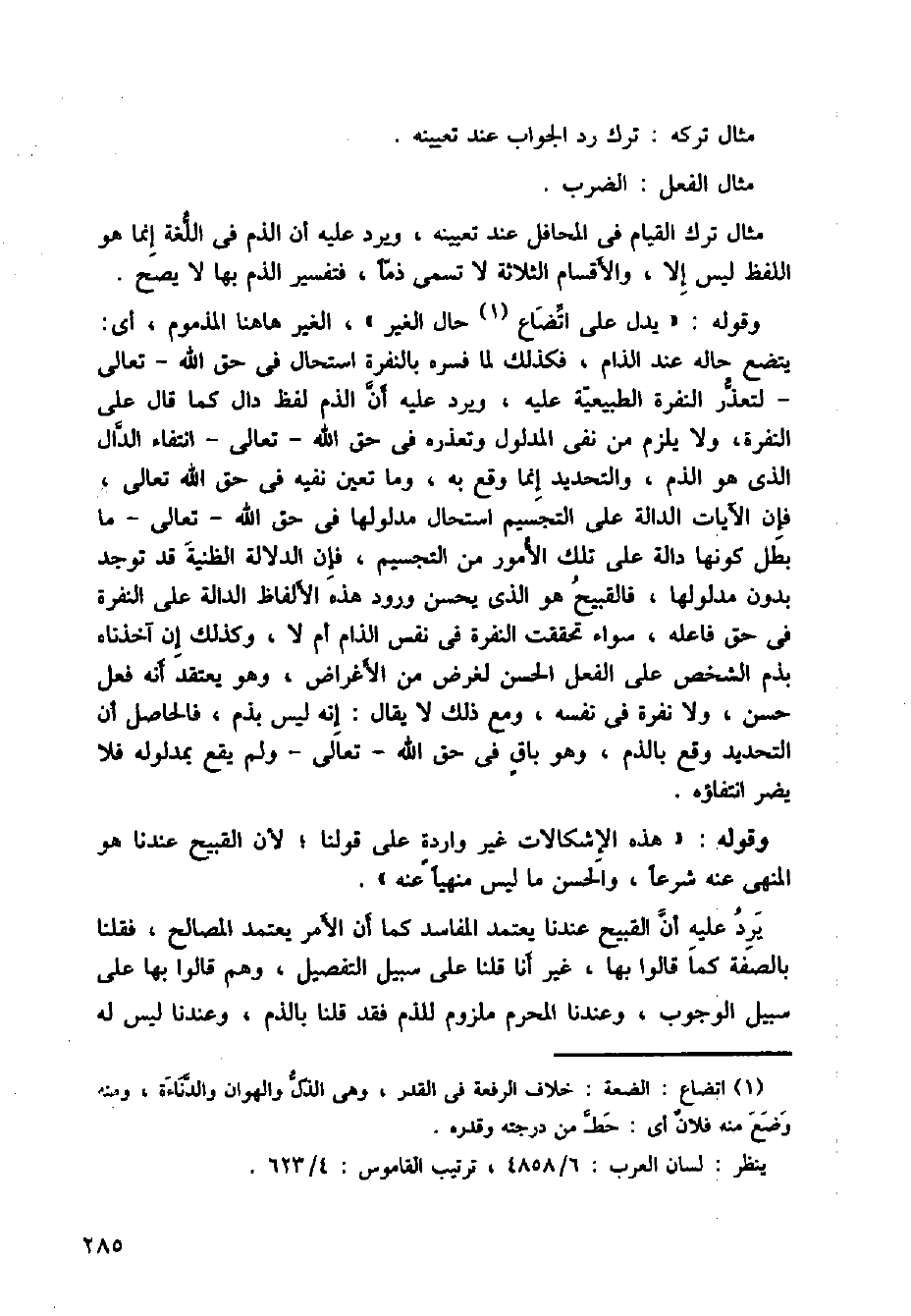 وقوله: ((يدل على اتضاح حال الغير))، الغير هاهنا المذموم، أي: يتضح حاله عند الذام، فكذلك لما فسره بالنفرة استحال في حق الله - تعالى - لتعذر النفرة الطبيعية عليه، ويرد عليه أن الذم لفظ دال كما قال على النفرة، ولا يلزم من فني المدلول وتعذره في حق الله - تعالى - انتفاء الدال الذي هو الذم، والتحديد إنما وقع به، وما تعين نفيه في حقا لله تعالى، فإنا لآيات الدالة على التجسيم استحال مدلولها في حق الله - تعالى - ما بطل كونها دالة على تلك الأمور من التجسيم، فإن الدلالة الظنية قد توجد بدون مدلولها، فالقبيح هو الذي يحسن ورود هذه الألفاظ الدالة على النفرة في حق فاعله، سواء تحققت النفرة في نفس الذام أم لا، وكذلك إن آخذناه بذم الشخص على الفعل الحسن لغرض من الأغراض، وهو يعتقد أنه فعل حسن، ولا نفرة في نفسه، ومع ذلك لا يقال: إنه ليس بذم، فالحاصل أن التحديد وقع بالذم / وهو باق في حق الله - تعالى - ولم يقع بمدلوله فلا يضر انتفاؤه.
