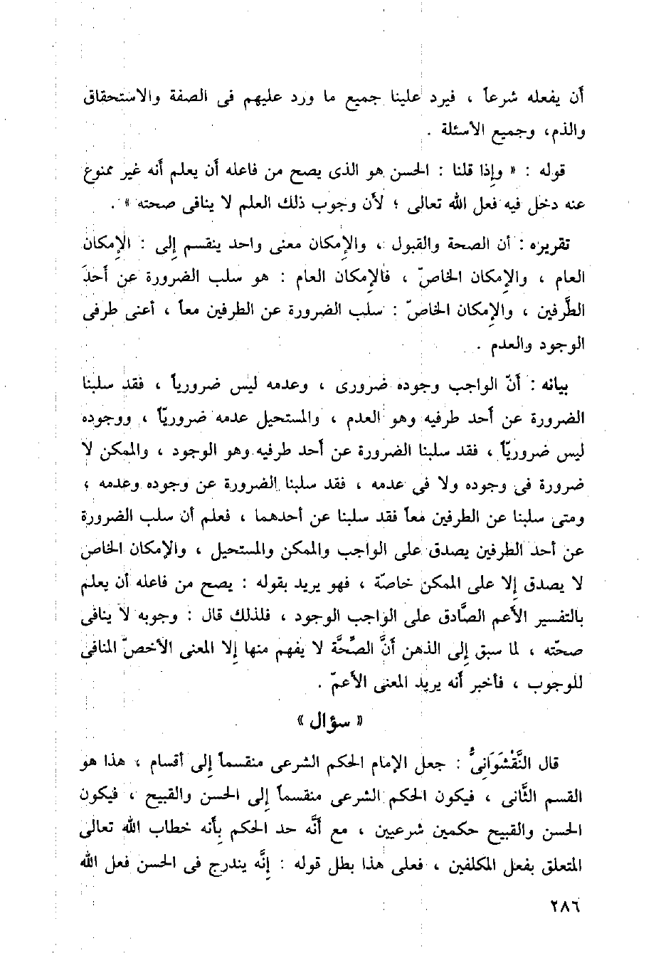 قال النقشواني: جعل الإمام الحكم الشرعي منفسما إلى أقسام، هذا هو القسم الثاني، فيكون الحكم الشرعي منقسما إلى الحسن والقبيح، فيكون الحسن والقبيح حكمين شرعيين، مع أنه حدا لحكم بأنه خطاب الله تعالى المتعلق بفعل المكلفين، فعلى هذا بطل قوله: إنه يندرج في الحسن فعل الله