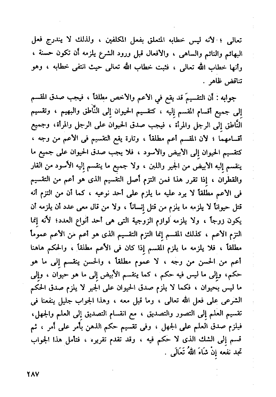 جوابه: أن التقسيم قد يقع في الأعم والأخص مطلقا، فيجب صدق المقسم إلى جميع أقسام المقسم إليه، كتقسيم الحيوان إلى الناطق والبهيم، وتقسيم الناطق إلى الرجل والمرأة، فيجب صدق الحيوان على الرجل والمرأة، وجميع أقسامها؛ لأن المقسم أعم مطلقا، وتارة يقع التقسيم في الأعم من وجه، كتقسيم الحيوان إلى الأبيض والأسود، فلا يجب صدق الحيوان على جميع ما ينقسم إليه الأبيض والأسود، فلا يجب صدق الحيوان على جميع ما ينقسم إليه الأبيض ومن الجير واللبن، ولا جميع ما ينقسم إليه الأسود من القار والقطران، إذا تقرر هذا فمن التزم أصل التقسيم الذي هو أعم من التقسيم في الأعم مطلقا لا يرد عليه ما يلزم على أحد نوعيه، كما أن من التزم أنه قتل حيوانا لا يلزمه ما يلزم من قتل إنسانا، ولا من قال معي عدد أن يلزمه أن يكون زوجا، ولايلزمه لوازم الزوجية التي هي أحد أنواع العدد، لأنه إنما التزم الأعم، كذلك التقسيم إنما التزم التقسيم الذي هو أعم مطلقا، والحكم هاهنا أعم من الحسن من وجه، لا عموم مطلقا، والحسن ينقسم إلى ما هو حكم، وإلى ما ليس فيه حكم، كما ينقسم الأبيض إلى ما هو حيوان، وإلى ما ليس بحيوان، فكما لا يلزم صدق الحيوان على الجير لا يلزم صدق الحكم الشرعي على فعل الله تعالى، وما قيل معه، وهذا الجواب جليل ينفعنا في تقسيم العلم إلى التصور والتصديق، مع انقسام التصديق إلى العلم والجهل، فيلزم صدق العلم على الجهل، وفي تقسيم حكم الذهن بأمر على أمر، ثم قسم إلى الشك الذي لا حكم فيه، وقد تقدم تقريره، فتأمل هذا الجواب تجد نفعه إن شاء الله تعالى.