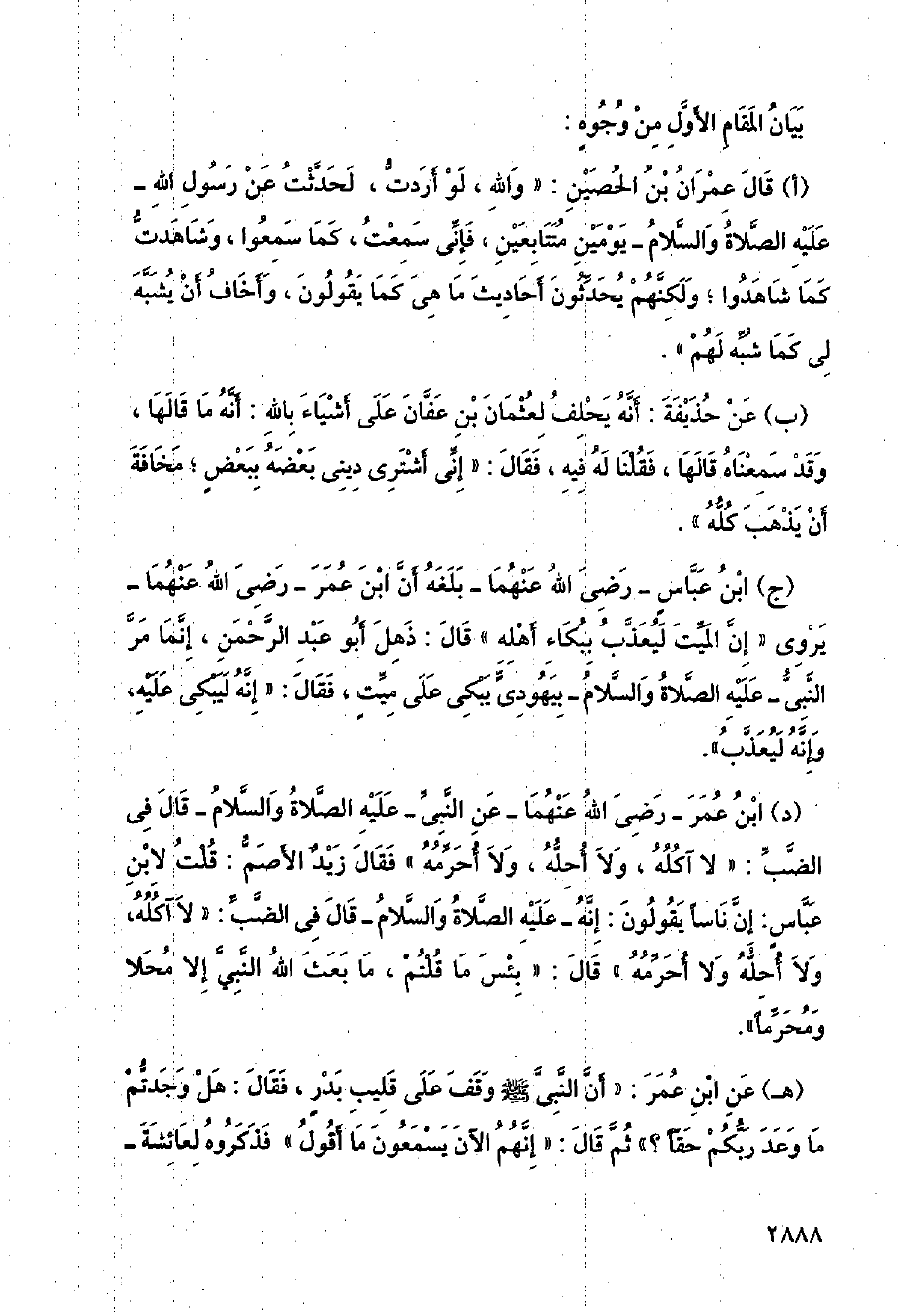(أ) قال عمران بن الحصين: (والله، لو أردت، لحدثت عن رسول الله- عليه الصلاة والسلام- يومين متتابعين، فإني سمعت، كما سمعوا، وشاهدت كما شاهدوا؛ ولكنهم يحدثون أحاديث ما هي كما يقولون، وأخاف أن يشبه لي كما شبه لهم).