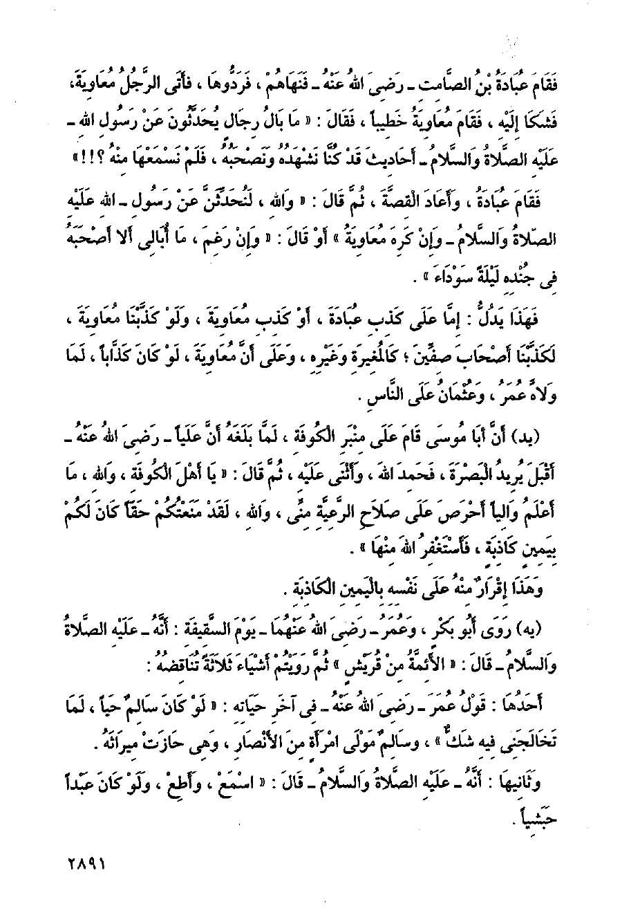 فهذا يدل: إما على كذب عبادة، أو كذب معاوية، ولو كذبنا معاوية، لكذبنا أصحاب صفين؛ كالمغيرة وغيره، وعلى أن معاوية، لو كان كذابًا، لما ولاه عمر، وعثمان على الناس.