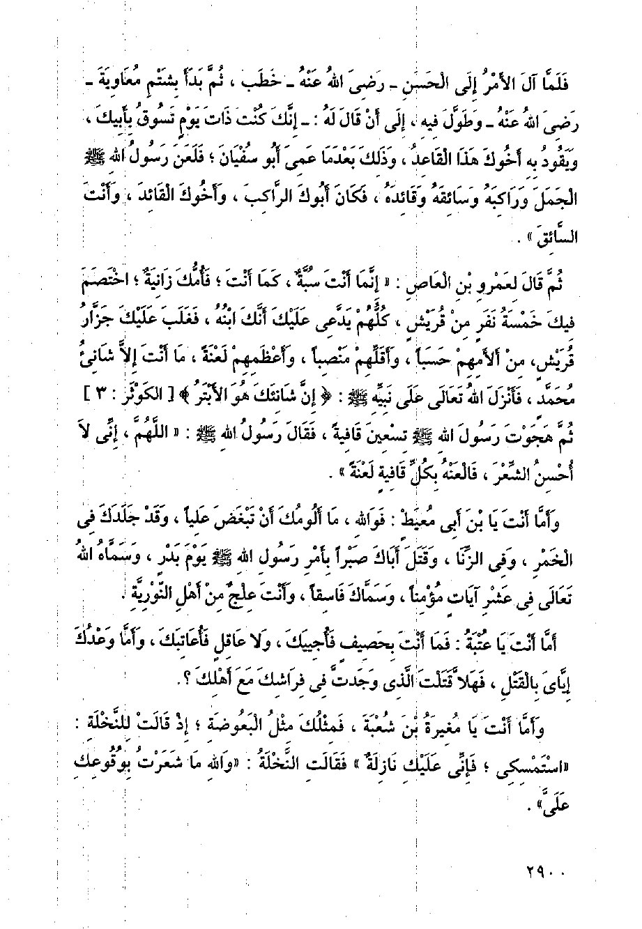 فلما آل الأمر إلى الحسن- رضي الله عنه- خطب، ثم بدأ بشتم معاوية- رضي الله عنه- وطول فيه، إلى أن قال له:- إنك كنت ذات يومٍ تسوق بأبيك، ويقود به أخوك هذا القاعد، وذلك بعدما عمى أبو سفيان؛ فلعن رسول اله - صلى الله عليه وسلم - الجمل وراكبه وسائقه وقائده، فكان أبوك الراكب، وأخوك القائد، وأنت السائق).