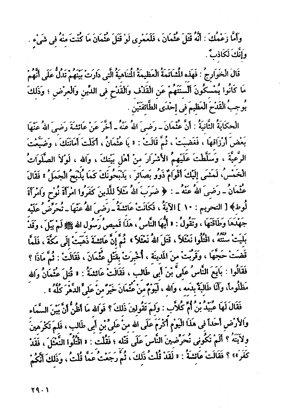 الحكاية الثانية: أن عثمان- رضي الله عنه- أخر عن عائشة رضي الله عنها بعض أرزاقها، فغضبت، ثم قالت: (يا عثمان، أكلت أمانتك، وضيعت الرعية، وسلطت عليهم الأشرار من أهل بيتك، والله، لولا الصلوات الخمس، لمشى إليك أقوام ذوو بصائر، يذبحونك كما يذبح الجمل) فقال عثمان- رضي الله عنه-: {ضرب الله مثلًا للذين كفروا امرأة نوح وامرأة لوط} [التحريم: 10] الآية، فكانت عائشة- رضي الله عنها- تحرض عليه جهدها وطاقتها، وتقول: (أيها الناس، هذا قميص رسول الله - صلى الله عليه وسلم - لم يبل، وقد بليت سنته، اقتلوا نعثلًا، قتل الله نعثلًا) ثم إن عائشة ذهبت إلى مكة، فلما قضت حجها، وقربت من المدينة، أخبرت بقتل عثمان، فقالت: ثم ماذا؟ فقالوا: بايع الناس على بن أبي طالب، فقالت عائشة: (قتل عثمان والله مظلومًا، وأنا طالبة بدمه، والله، ليوم من عثمان خير من على الدهر كله).