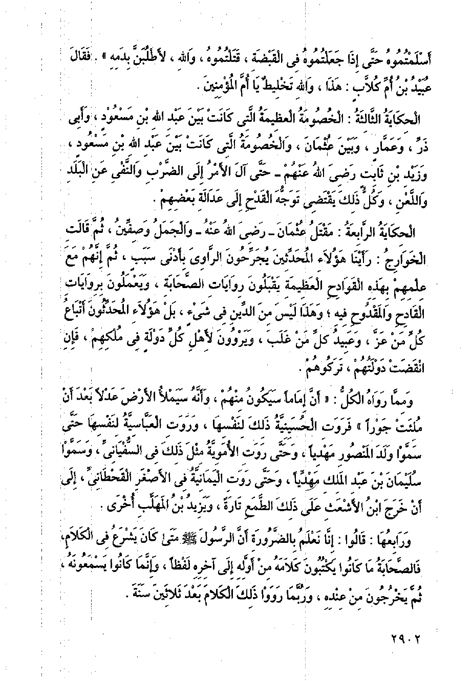 الحكاية الرابعة: مقتل عثمان- رضي الله عنه- والجمل وصفين، ثم قالت الخوارج: رأينا هؤلاء المحدثين يجرحون الراوي بأدنى سبب، ثم إنهم مع علمهم بهذه القوادح العظيمة يقبلون روايات الصحابة، ويعلمون بروايات القادح والمقدوح فيه؛ وهذا ليس من الدين في شيء، بل هؤلاء المحدثون أتباع كل من عز، وعبيد كل من غلب، ويروون لأهل كل دولةٍ في ملكهم، فإن انقضت دولتهم، تركوهم.