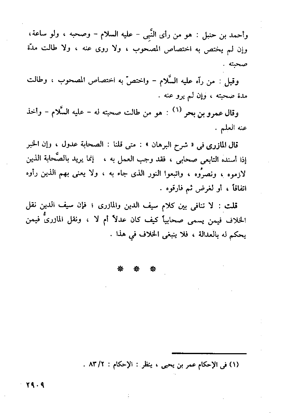 وأحمد بن حنبل: هو من رأى النبي-عليه السلام- وصحبه، ولو ساعة، وإن لم يختص به اختصاص المصحوب، ولا روى عنه، ولا طالت مدة صحبته.