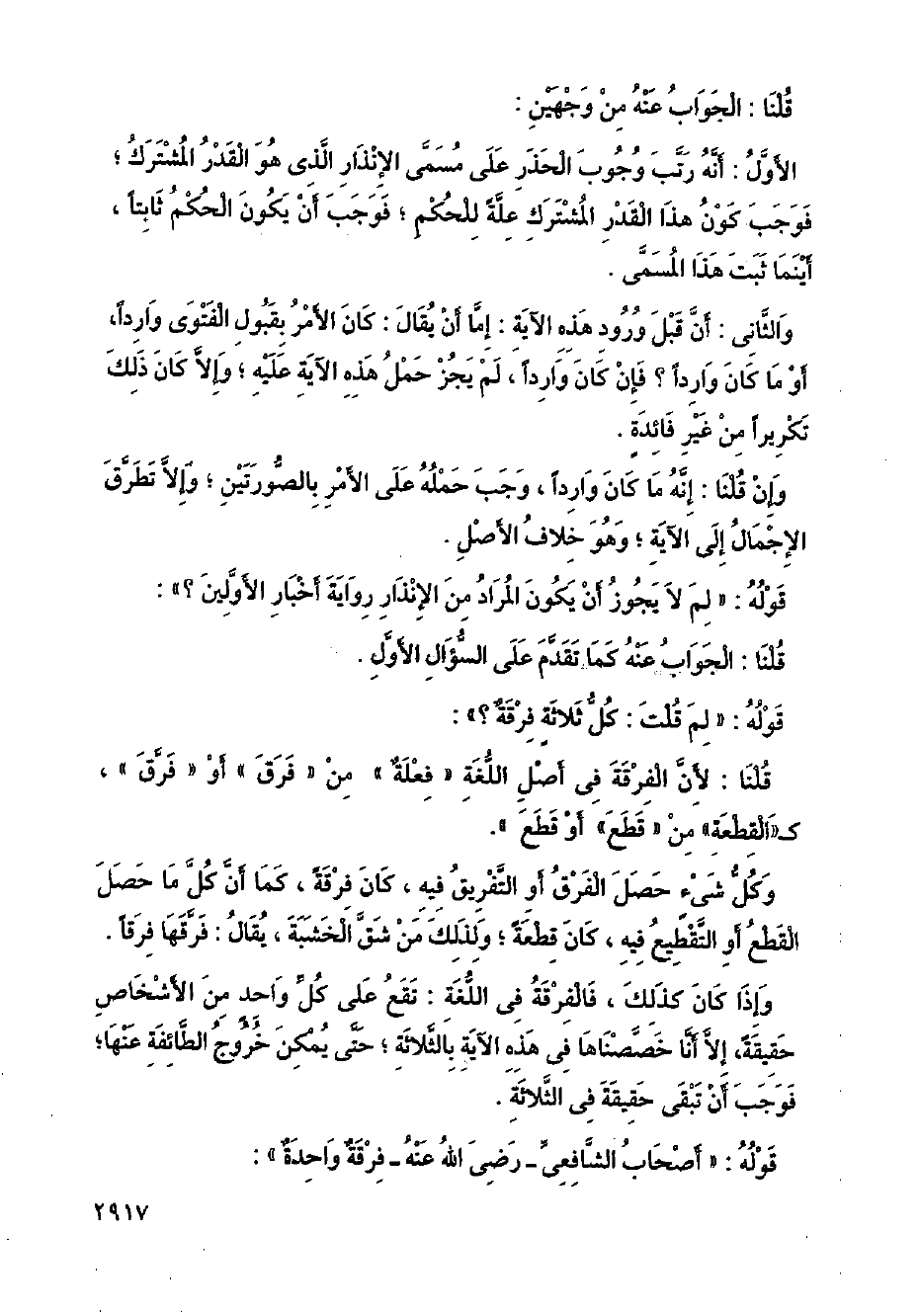 وإذا كان كذلك، فالفرقة في اللغة: تقع على كل واحد من الأشخاص حقيقة، إلا أنا خصصناها في هذه الآية بالثلاثة؛ حتى يمكن خروج الطائفة عنها؛ فوجب أن تبقى حقيقة في الثلاثة.