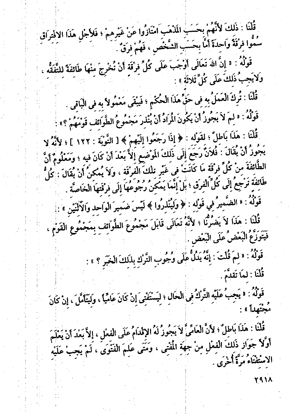 قلنا: هذا باطل؛ لقوله: {إذا رجعوا إليهم} [التوبة: 122]؛ لأنه لا يجوز أن يقال: فلان رجع إلى ذلك الموضع إلا بعد أن كان فيه؛ ومعلوم أن الطائفة من كل فرقة ما كانت في غير تلك الفرقة، ولا يمكن أن يقال: كل طائفة ترجع إلى كل الفرق؛ بل إنما يمكن رجوعها إلى فرقتها الخاصة.