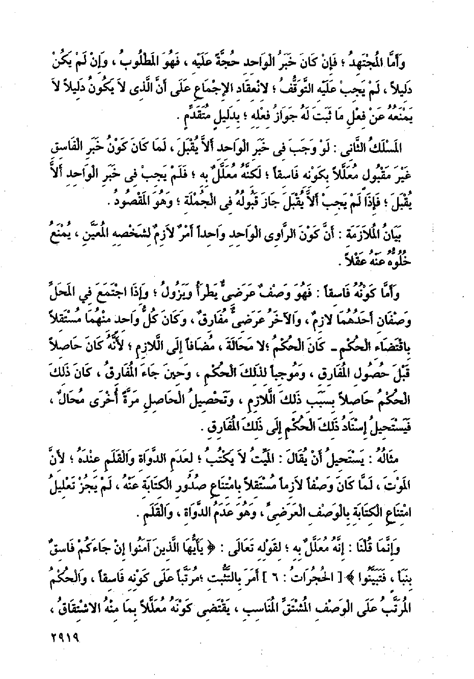 المسلك الثاني: لو وجب في خبر الواحد ألا يقبل، لما كان كون خبر الفاسق غير مقبول معللًا بكونه فاسقًا؛ لكنه معلل به؛ فلم يجب في خبر الواحد ألا يقبل؛ فإذا لم يجب ألا يقبل جاز قبوله في الجملة؛ وهو المقصود.
