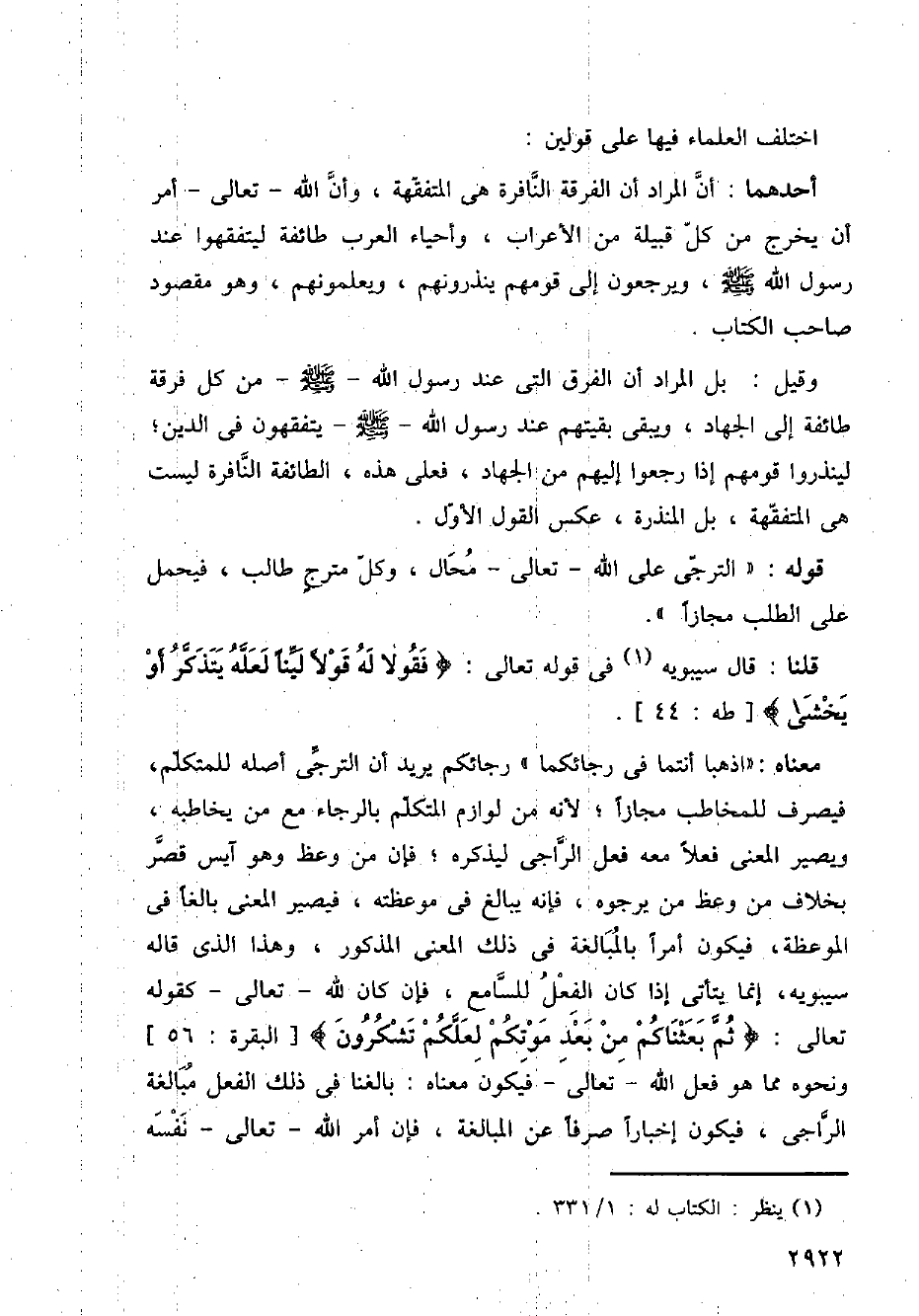 أحدهما: أن المراد أن الفرقة النافرة هي المتفقة، وأن الله-تعالى- أمر أن يخرج من كل قبيلة من الأعراب، وأحياء العرب طائفة ليتفقهوا عند رسول الله - صلى الله عليه وسلم -، ويرجعون إلى قومهم ينذرونهم، ويعلمونهم، وهو مقصود صاحب الكتاب.