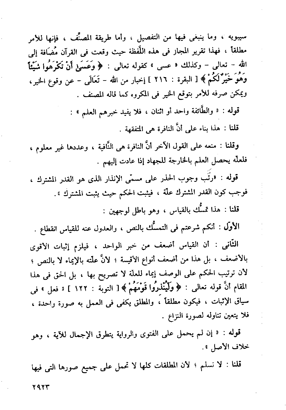 الثاني: أن القياس أضعف من خبر الواحد، فيلزم إثبات الأقوى بالأضعف، بل هذا من أضعف أنواع الأقيسة؛ لأن علته بالإيماء لا بالنص؛ لا ترتيب الحكم على الوصف إيماء للعلة لا تصريح بها، بل احلق في هذا المقام أن قوله تعالى: {ولينذروا قومهم} [التوبة:122] (فعل) في سياق الإثبات، فيكون مطلقًا، والمطلق يكفى في العمل به صورة واحدة، فلا يتعين تناوله لصورة النزاع.