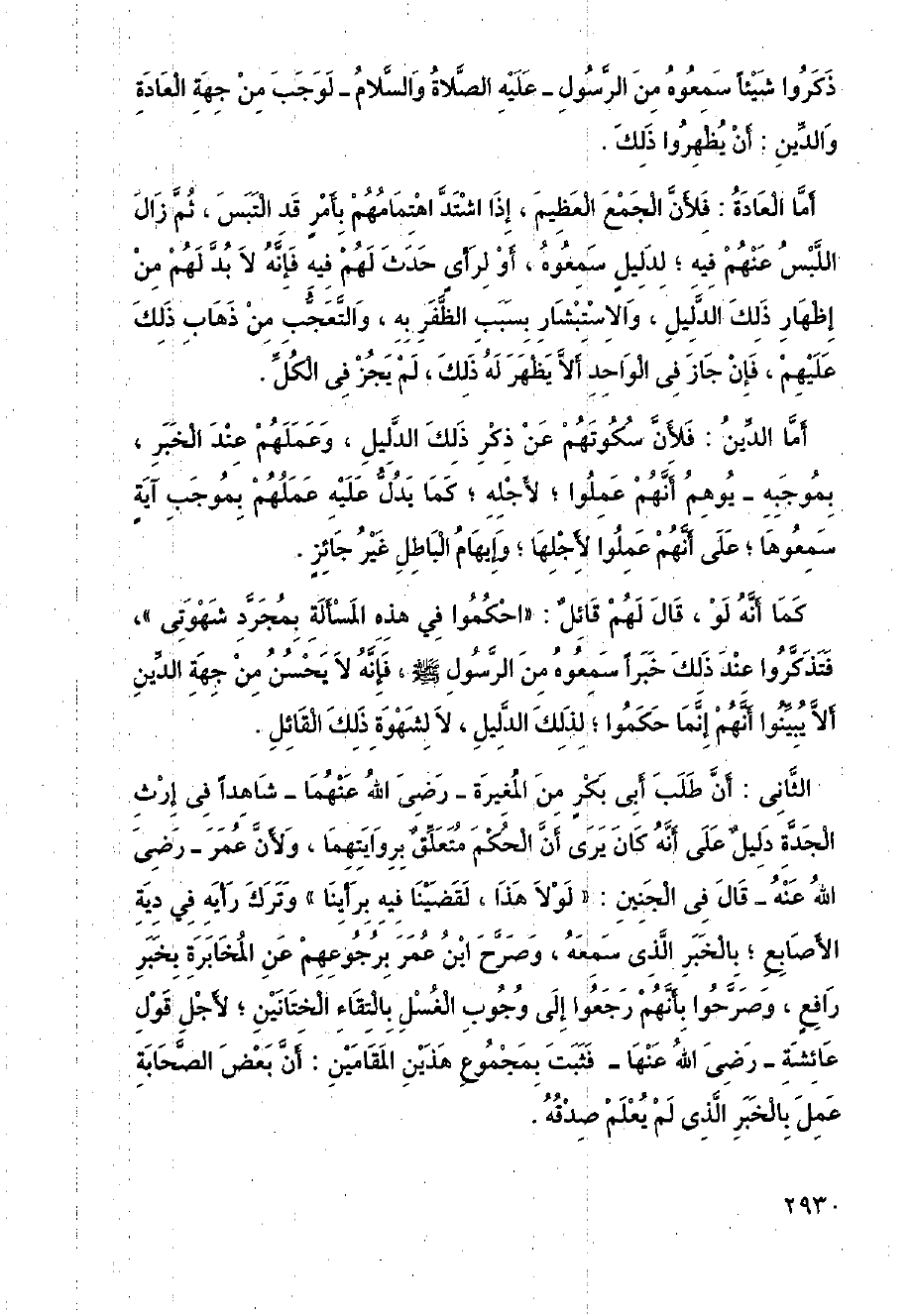 الثاني: أن طلب أبي بكر من المغيرة-رضي الله عنهما- شاهدًا في إرث الجدة دليل على أنه كان يرى أن الحكم متعلق بروايتهما، ولأن عمر-رضي الله عنه-قال في الجنين: (لولا هذا، لقضينا فيه برأينا) وترك رأيه في دية الأصابع؛ بالخبر الذي سمعه، وصرح ابن عمر برجوعهم عن المخابرة بخبر رافع، وصرحوا بأنهم رجعوا إلى وجوب الغسل بالتقاء الختانين؛ لأجل قول عائشة-رضي الله عنها- فثبت بمجموع هذين المقامين: أن بعض الصحابة عمل بالخبر الذي لم يعلم صدقه.