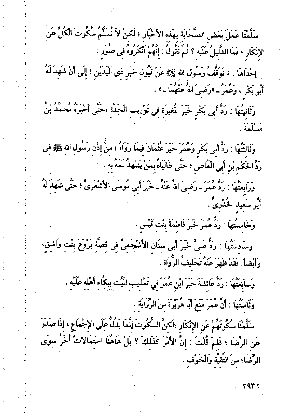 وثالثتها: رد أبي بكر وعمر خبر عثمان فيما رواه؛ من إذن رسول الله - صلى الله عليه وسلم - في رد الحكم بن أبي العاص؛ حتى طالباه بمن يشهد معه به.
