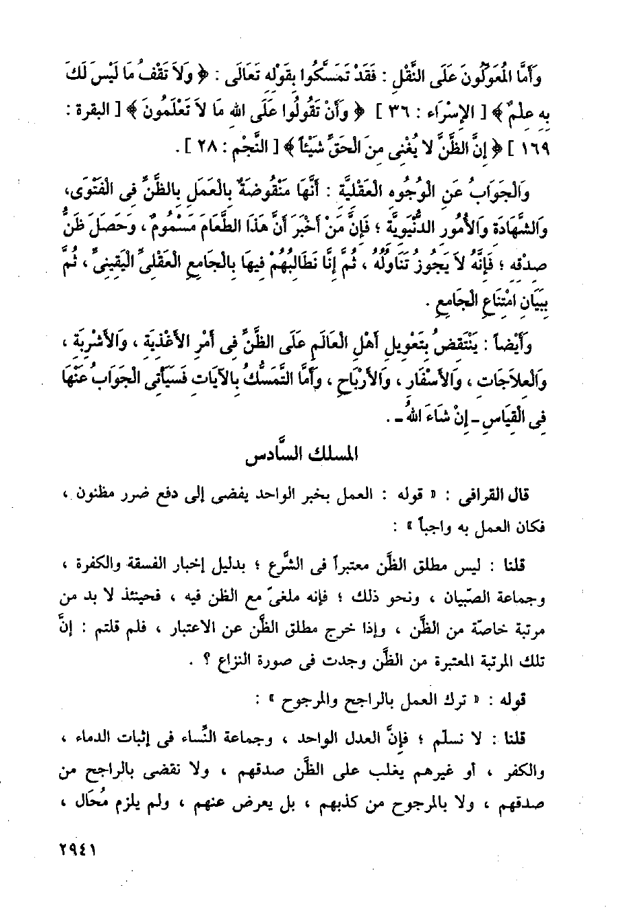 قال القرافي: (قوله: العمل بخبر الواحد يفضى إلى دفع ضرر مظنون، فكان العمل به واجبًا):