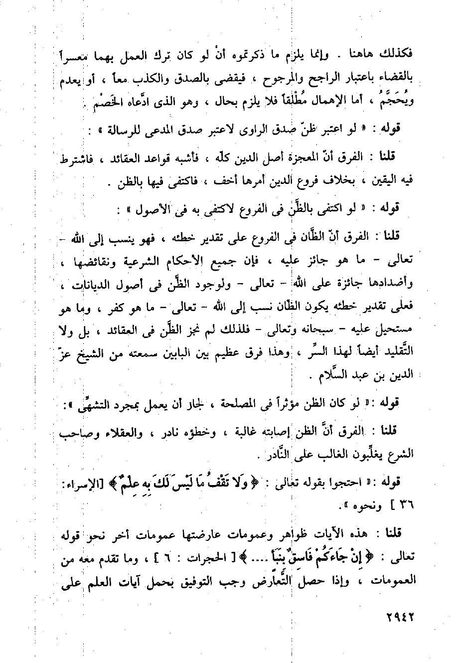 قلنا: الفرق أن الظان في الفروع على تقدير خطئه، فهو ينسب إلى الله-تعالى- ما هو جائز عليه، فإن جميع الأحكام الشرعية ونقائضها، وأضدادها جائزة على الله-تعالى- ولوجود الظن في أصول الدينات، فعلى تقدير خطئه يكون الظان نسب إلى الله-تعالى- ما هو كفر، وما هو مستحيل عليه-سبحانه وتعالى- فلذلك لم نجز الظن في العقائد، بل ولا التقليد أيضًا لهذا السر، وهذا فرق عظيم بين البابين سمعته من الشيخ عز الدين بن عبد السلام.
