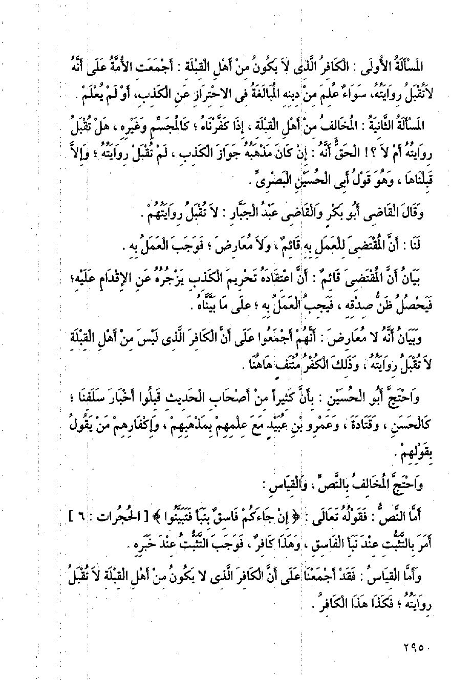 المسألة الثانية: المخالف من أهبل القبلة، إذا كفرناه؛ كالمجسم وغيره، هل تقبل روايته أم لا؟! الحق أنه: إن كان مذهبه جواز الكذب، لم تقبل روايته؛ وإلا قبلناها، وهو قول أبي الحسين البصري.