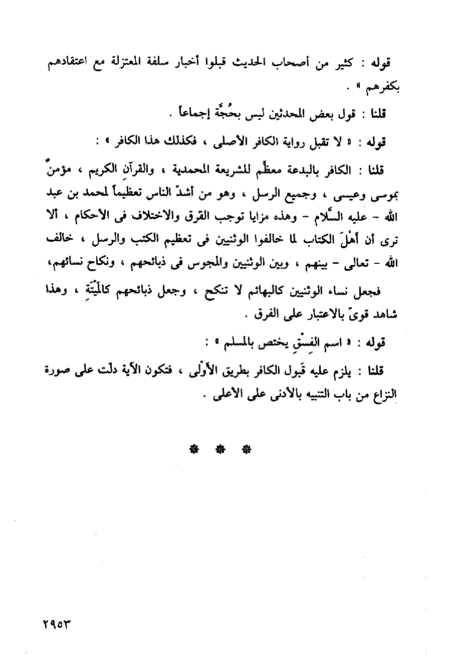 قلنا: الكافر بالبدعة معظم للشريعة المحمدية، والقرآن الكريم، مؤمن بموسى وعيسى، وجميع الرسل، وهو من أشد الناس تعظيمًا لمحمد بن عبد الله-عليه السلام- وهذه مزايا توجب القرق والاختلاف في الأحكام، ألا ترى أن أهل الكتاب لما خالفوا الوثنيين في تعظيم الكتاب والرسل، خالف الله-تعالى- بينهم، وبين الوثنيين والمجوس في ذبائحهم، ونكاح نسائهم، فجعل نساء الوثنيين كالبهائم لا تنكح، وجعل ذبائحهم كالميتة، وهذا شاهد قوي بالاعتبار على الفرق.