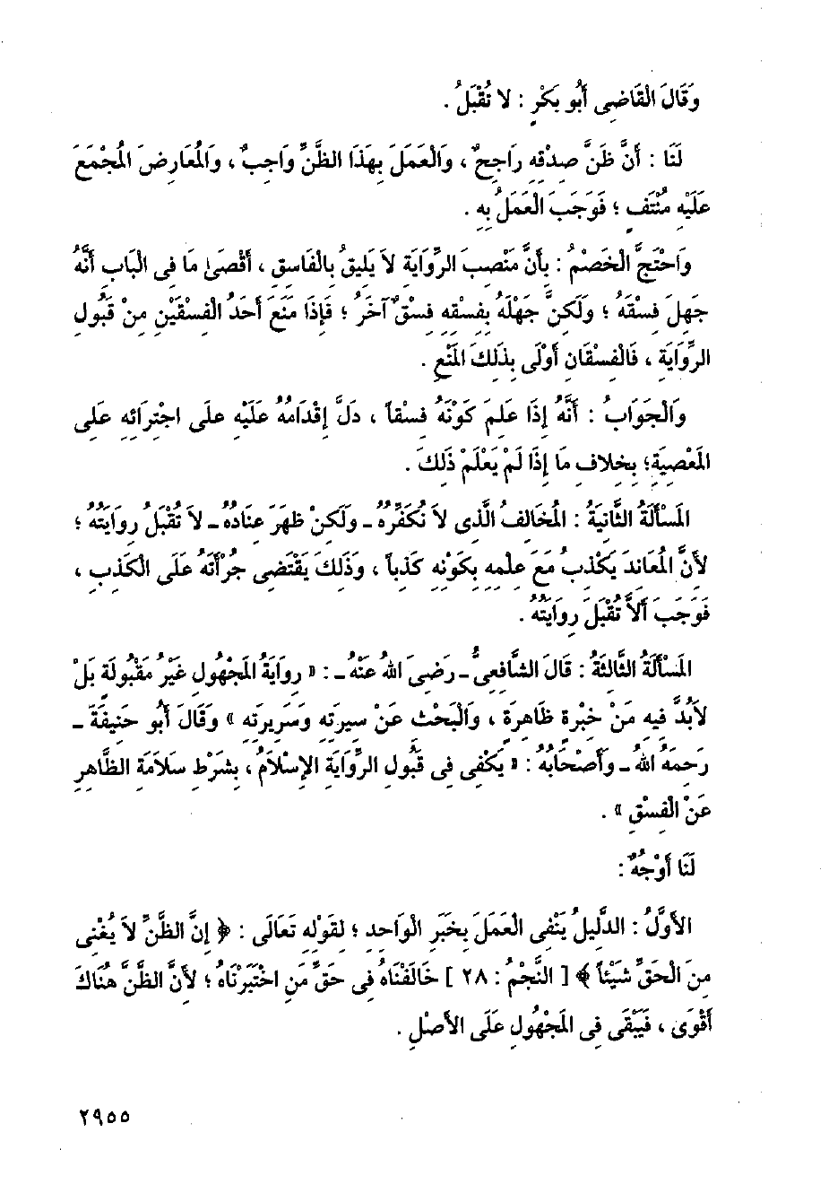 الأول: الدليل ينفى العمل بخبر الواحد؛ لقوله تعالى: {إن الظن لا يغنى من الحق شيئًا} [النجم: 28] خالفناه في حق من اختبرناه؛ لأن الظن هناك أقوى، فيبقى في المجهول على الأصل.