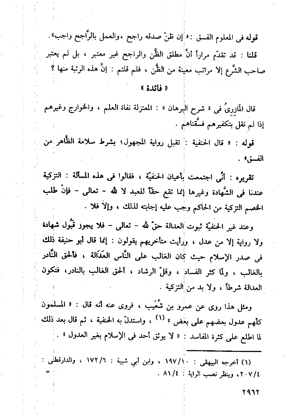 وعند غير الحنفية ثبوت العدالة حق الله-تعالى- فلا يجوز قبول شهادة ولا رواية إلا من عدل، ورأيت متأخريهم يقولون: إنما قال أبو حنيفة ذلك في صدر الإسلام حيث كان الغالب على الناس العدالة، فألحق النادر بالغالب، ولما كثر الفساد، وقل الرشاد، ألحق الغالب بالنادر، فتكون العدالة شرطًا، ولا بد من التزكية.